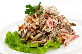 Картофель, говядина, соленый огурчик, грибы, перчик, яйцо, сыр, майонез. 180 гр.
