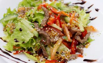 Айсберг, говядина, огурчик свежий, перец болгарский, кунжут, медовый соус. 170 гр.